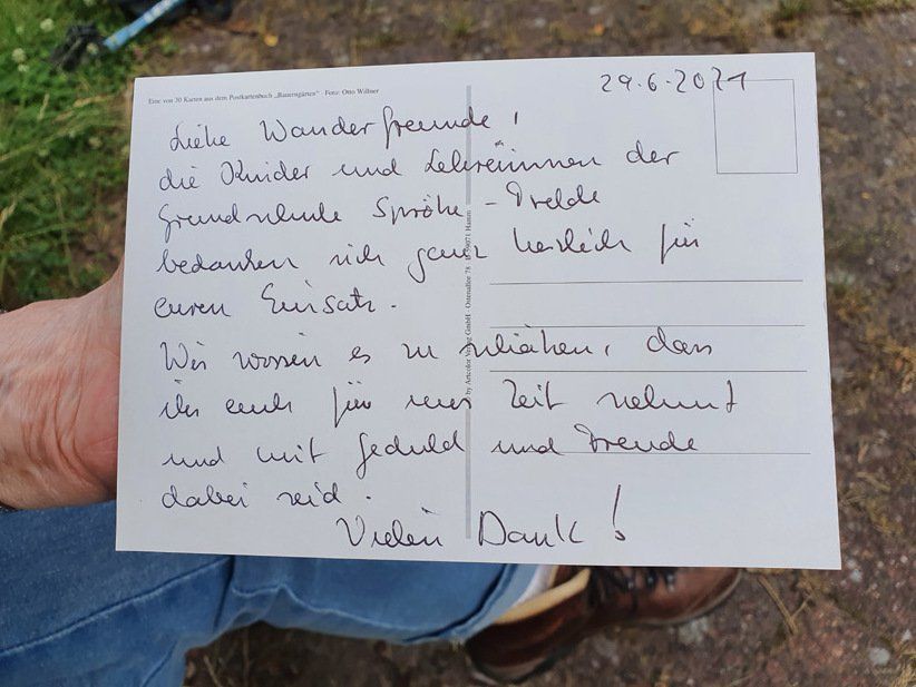 Die Aufgaben sind gelöst und so können wir unserem Ziel entgegen gehen. Es ist das Jugendferienheim Sprötze. Ein großer Teil der Schüler ist schon angekommen und begrüßt uns. Für die Wanderfreunde Norbert, Svend, Elke und Thomas gibt es ein großes „Dankeschön für die Unterstützung“ in Form von Schokolade. Ein Geschenk der Grundschule Sprötze-Trelde. Für die Wanderfreunde ist hier Schluss, für die Kinder startet jetzt noch ein Orientierungslauf.