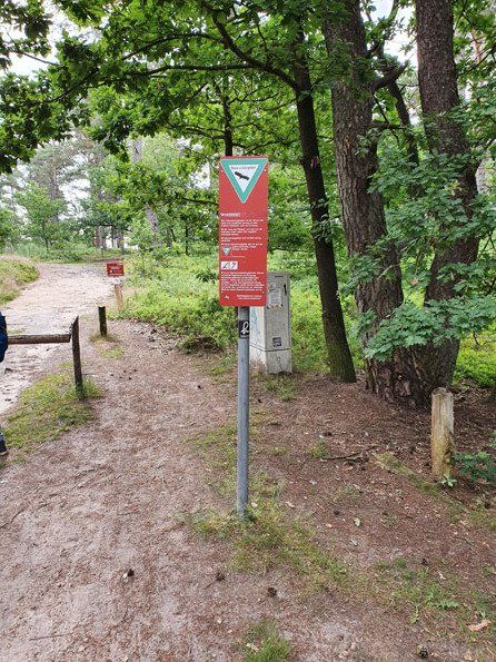 Bei Ziel Nummer fünf stehen wir vor einer Holzschranke. Rechts davon ein großes rotes Schild in dem sich ein grünweißes Dreieck mit einem Greifvogel befindet . Wir sind im Naturschutzgebiet Brunsberg angekommen. Norbert erklärt den Kindern, dass es im Naturschutzgebiet grundsätzlich verboten ist, die Grünflächen zu betreten und Hunde müssen hier natürlich an die Leine genommen werden.
