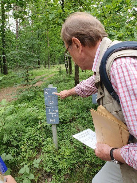 Das vierte Ziel ist besonders interessant. Ein blaues Schild mit weißer Schrift. Eine Wassertafel. Norbert erklärt den Kindern, was die Zahlen und Striche bedeuten. Auch ich habe dazugelernt. Weiter geht es Richtung Brunsberg. Schon aus der Ferne kann man ihn sehen und erfahren, dass der Brunsberg 129 Meter hoch ist, nur 40 Meter weniger als der Wilseder Berg.