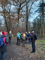 Auf steilem Weg ging es hinunter zur Fischbeker Heide. Wir querten diese und folgten dem Fischbektal ein Stück. Dann ging es hinauf zum Rodelberg, wo uns einige Bänke am Schulgelände zur Mittagspause einluden. Wir folgten nun dem gelben Dreieck mit der Kennzeichnung KA (Karlstein). Am Teich vorbei kamen wir zum Moisburger Stein und weiter zur Schulenburgseiche. Wir machten noch einen kleinen Umweg zur Großmoddereiche und kehrten dann zur Kaffeeeinkehr im Waldhuuske ein, wo es uns allen sehr gut gefiel. Es blieben nun noch ca. 3 km bis zu unseren Fahrzeugen, die wir nach 23 km wieder erreichten. Die Dunkelheit stand schon kurz bevor, ein sehr schöner Wandertag lag hinter uns.