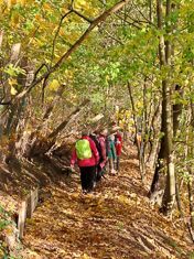 Durch herrlich gefärbte Wälder ging es wieder hinauf auf das „Hohe Elbufer“ und dann hinunter zum Biberweg. Hier sahen wir auch einen frisch von den Bibern gefällten Baum. Wir fanden einen netten Platz für unsere Mittagspause und kamen gut gestärkt nach Sandkrug. Hier befand sich vor vielen Jahrhunderten eine Furt durch die Elbe, ein Stück von der alten Salzstraße konnten wir noch sehen.