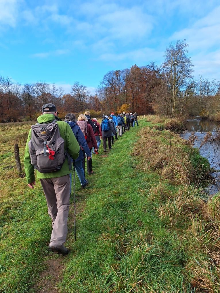 Wir erreichten zunächst den alten Ortskern von Bünzen mit dem Heimatmuseum ‚Dat ole Hus‘ und der alten Wassermühle. Nach Überquerung der B430 ging es den malerischen Uferweg an der Bünzau entlang, die wir mehrfach überquerten und, nach Durchquerung einer Weide mit langhörnigen Heckrindern, schließlich hinter uns ließen, um nach Osten Richtung Neumünster abzubiegen.