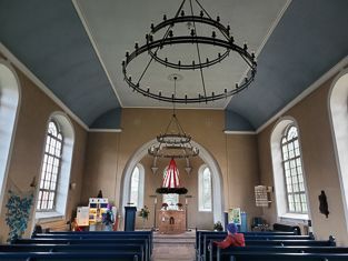 Auf z.T. kleinen Pfaden erreichen wir das Künstlerdorf Fischerhude. An der Kirche machen wir unsere Mittagsrast und nutzen die Zeit für eine kurze Besichtigung. Eine Besonderheit ist die Mauer rund um die Kirche, in der alte Grabsteine von Fischerhuder Familien eingelassen sind. Diese Grabsteine stammen vom Friedhof in Wilstedt, zu dessen Kirchspiel Fischerhude vor dem Errichten der eignen Kirche gehörte.